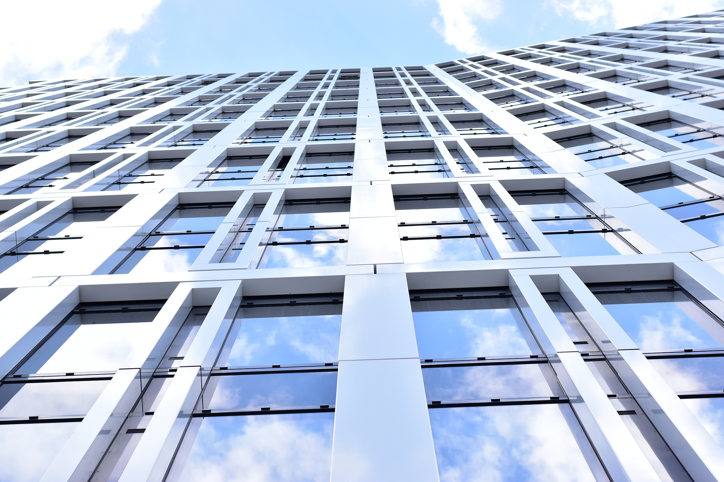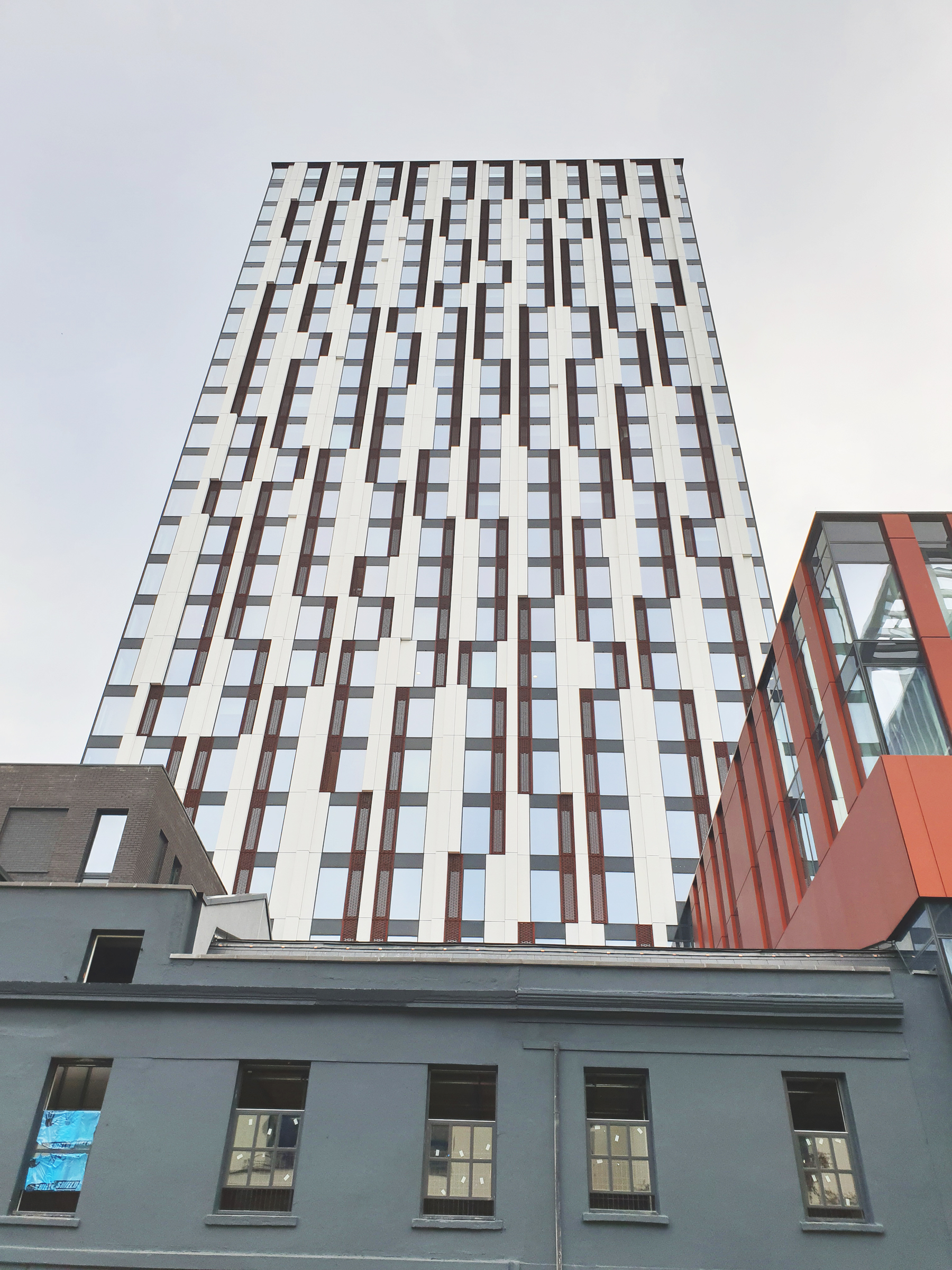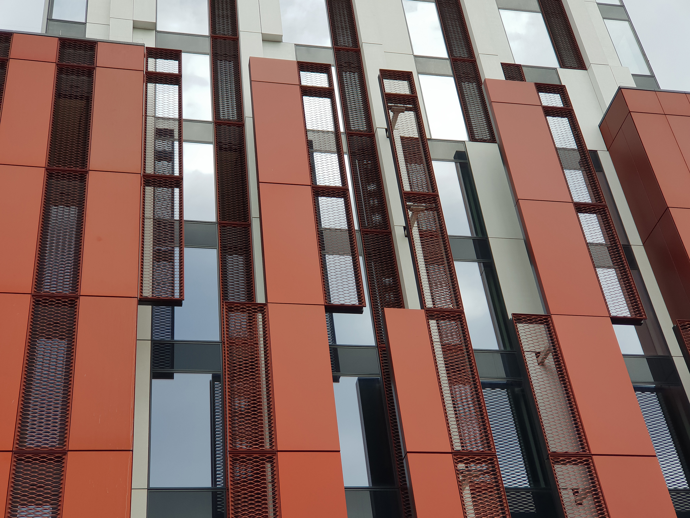 In Cardiff, a 26 floor high rise building was created, cladded with an unitized facade including 3D - GRC Panels, color anodized mesh in front of opening windows with trickle vents, automatic opening vents with actuators, color anodized metal panels, DGU with sun protection coating, areas with increased acoustic performance.