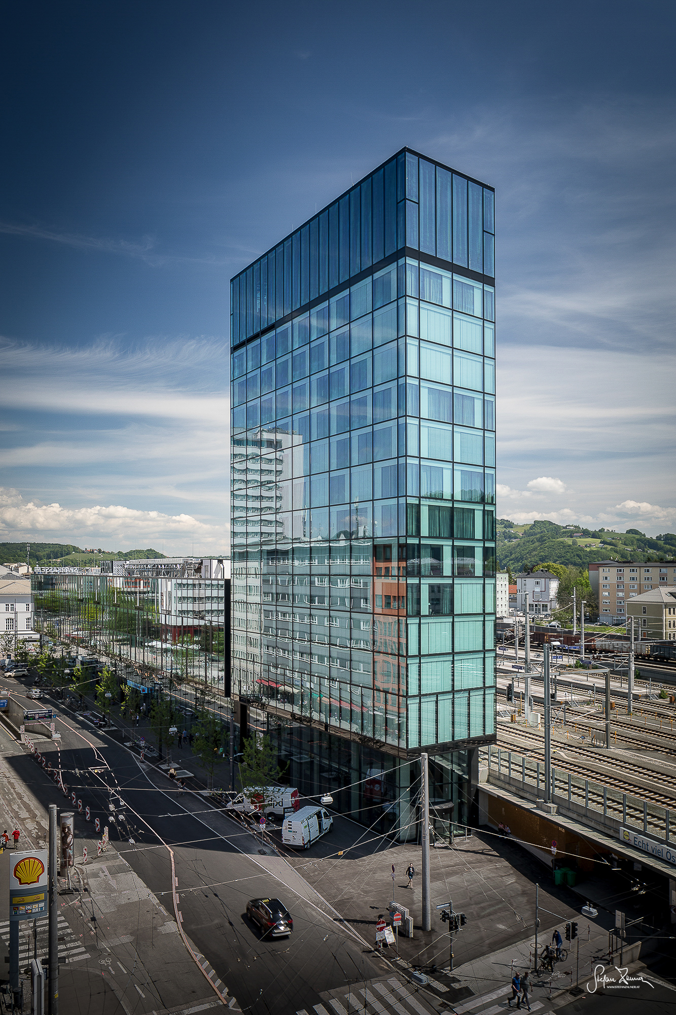 Der 54 Meter hohe Hotelturm umfasst 15 Stockwerke, an welchen ein 120 Meter langes, fünfgeschossiges Langhaus anschließt. In dem schlanken Hotel befinden sich rund 119 Zimmer, Büros, ein Wellnessbereich und ein Dachrestaurant sowie eine Tiefgarage auf zwei Ebenen. Das Langhaus besteht aus einer zweigeschoßigen Geschäftszeile, Büros und elf 60-m²-Wohnungen. Das transparente Glas-Metall-Gebilde, welches auch in der Nacht durch seine diversen Lichter wirkt, imponiert durch seine zeitlose Eleganz.